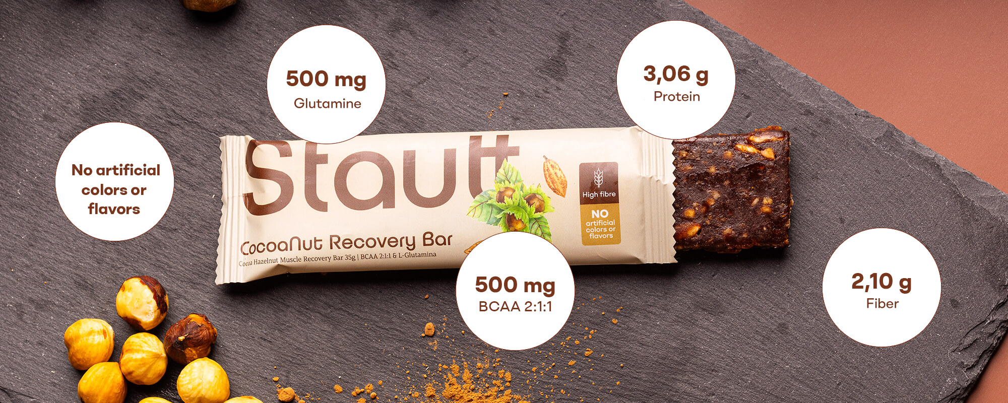 Discover the CocoaNut Recovery Bar by Stautt — a bar carefully formulated to support effective muscle recovery and deliver an authentic flavor. Each bar contains natural and organic ingredients that ensure balanced nutrition and a delicious taste.