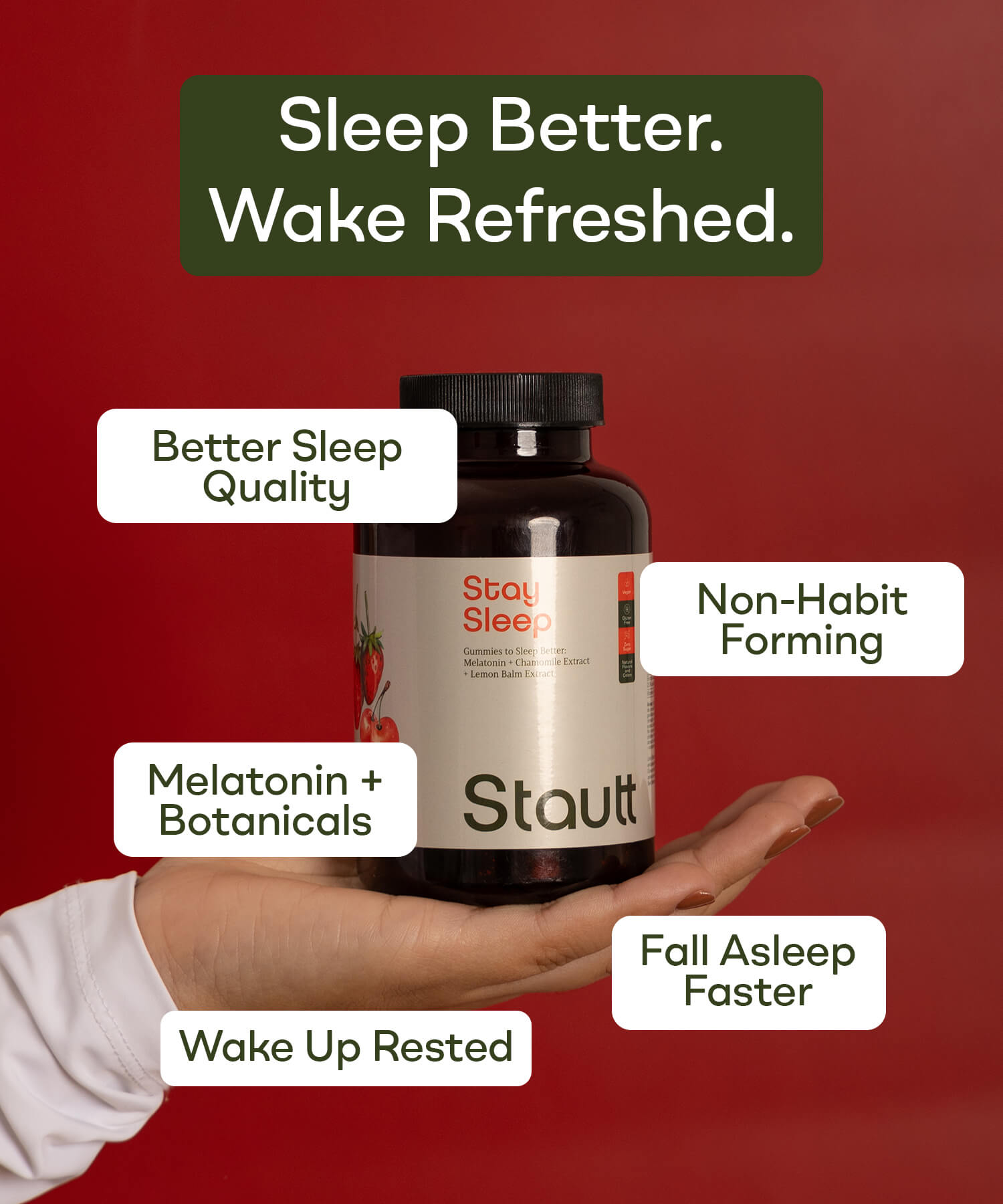 Discover Stay Sleep gummies by Stautt, formulated to improve sleep quality and reduce the time it takes to fall asleep. With melatonin, magnesium, and calming natural extracts, they help you enjoy a deep and restorative sleep.