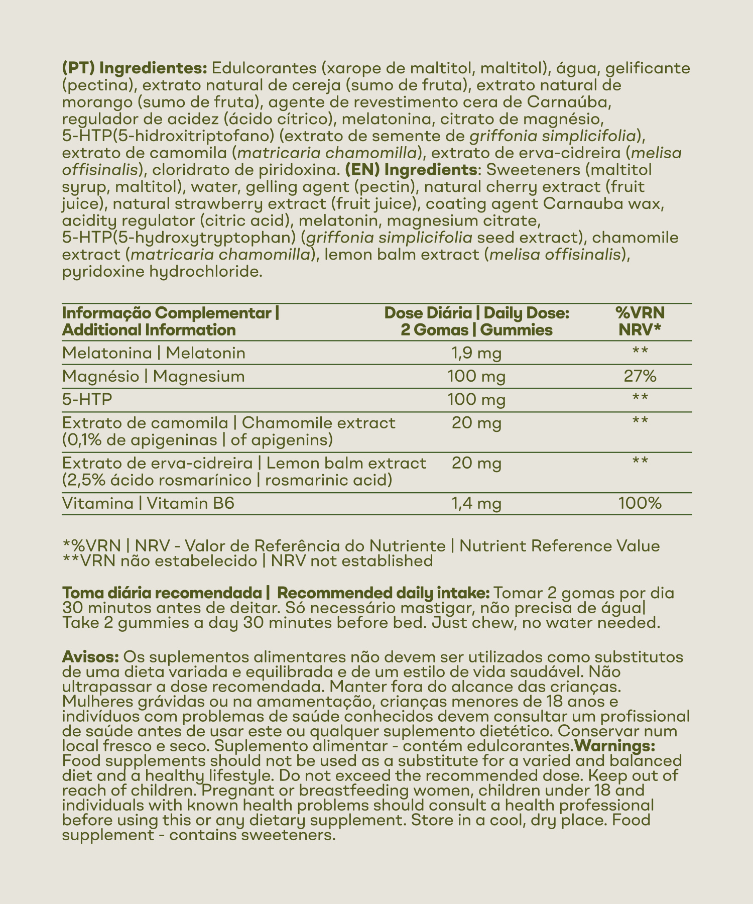 Ingredients: Sweeteners (maltitol syrup, maltitol), water, gelling agent (pectin), natural cherry extract (fruit juice), natural strawberry extract (fruit juice), coating agent: carnauba wax, acidity regulator (citric acid), melatonin, magnesium citrate, 5-HTP (5-hydroxytryptophan) (from griffonia seed extract), chamomile extract (matricaria chamomilla), lemon balm extract (melissa officinalis), pyridoxine hydrochloride (vitamin B6)